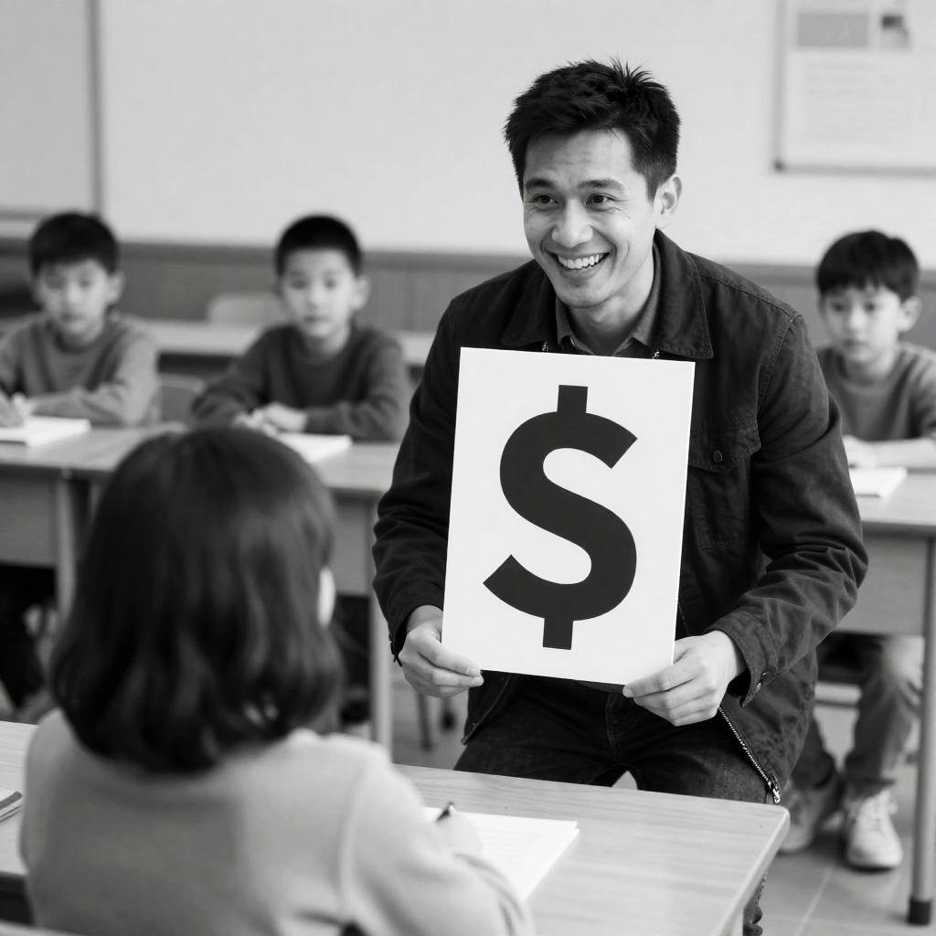 Black-and-white photograph of a man with short, dark hair, grinning widely, holding a sign with a large "S". He is standing in a classroom, facing a child with shoulder-length dark hair, back to the camera. Several other children are seated at desks in the background. The man is dressed in a dark jacket and the child in a light-colored sweater. The classroom has wooden furniture and a tiled floor. The man's expression is cheerful and engaged.
