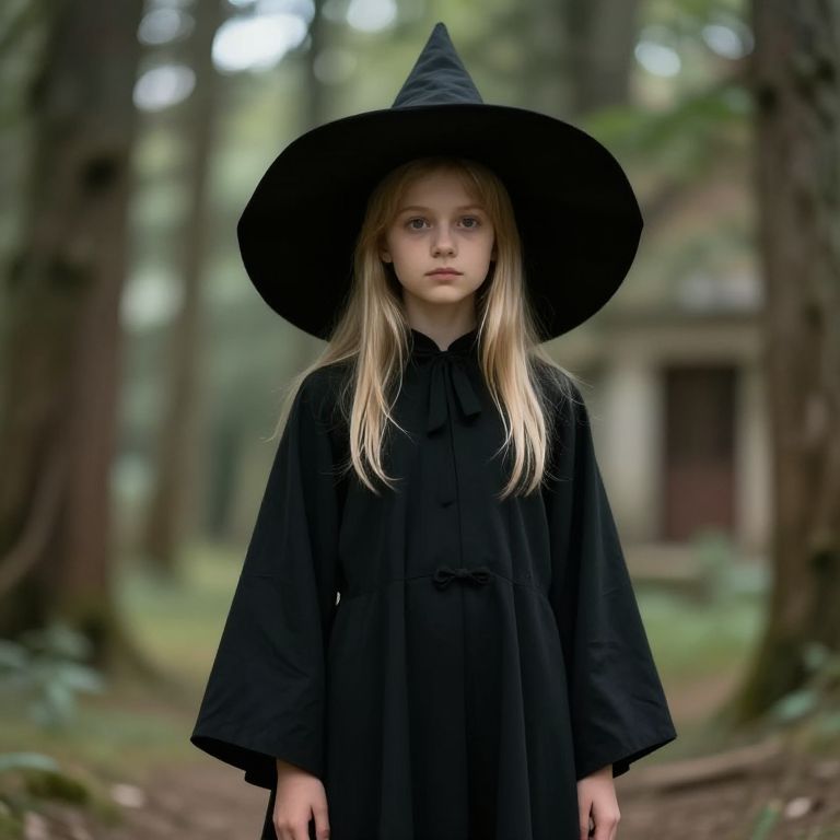 A young girl with blonde hair is wearing a black robe and a large hat with a wide brim. She is standing in a forest with trees and a building in the background.