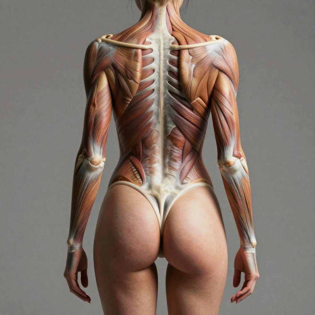 A (slender:0.3) ((handsome woman with a full (body art made of photorealistic drawing of anatomy of human muscule ))), close waist back view, best quality, sharp clear art
