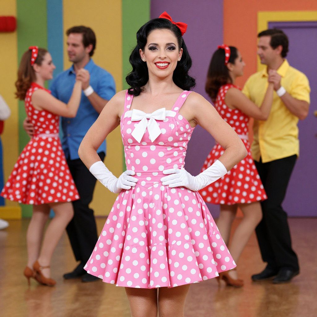 Photograph of a retro-style dance scene featuring a smiling woman with dark, wavy hair, wearing a pink polka dot dress with a white bow, white gloves, and a red hair bow. She stands confidently in the foreground, while two other women in red polka dot dresses and men in blue and yellow shirts dance in the colorful, vibrant background.