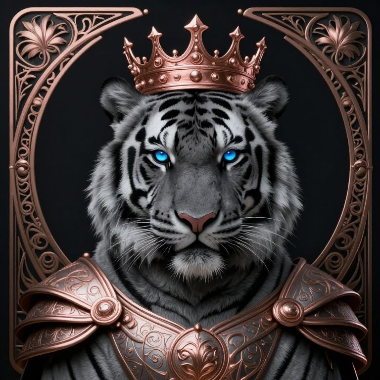 Digital artwork of a regal anthropomorphic white tiger with striking blue eyes, wearing an ornate, gold crown and matching armor. The tiger's fur is detailed with black stripes, and its expression is intense and noble. The background is a dark, gradient black, enhancing the tiger's luminous eyes and the gold's shine. The armor features intricate, floral patterns and is adorned with spherical accents. The image is framed by an elaborate, gold arch with similar floral designs. The overall style is realistic with a fantasy touch, emphasizing the tiger's majestic and powerful presence.