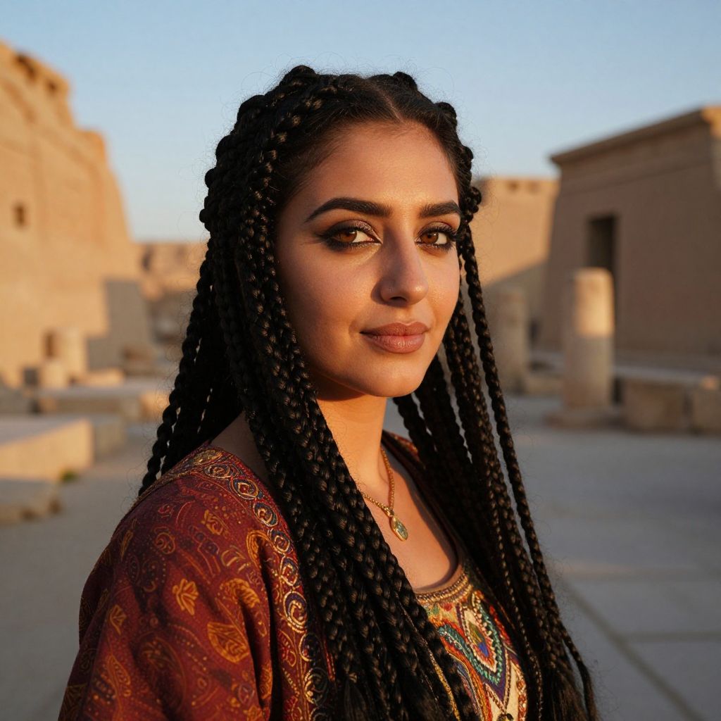 Photograph of a young woman with medium-brown skin and long, intricately braided black hair, standing in a sunlit, ancient ruin. She has large, expressive brown eyes, full lips with dark pink lipstick, and arched eyebrows. She wears a richly patterned, red and gold dress, and a detailed, multicolored necklace. The background features sunlit, beige stone ruins with shadows and a clear blue sky. Her confident, slightly smiling expression is highlighted by the warm, golden light. The image has a slightly stylized, digital enhancement effect, giving her features a smooth, polished look.