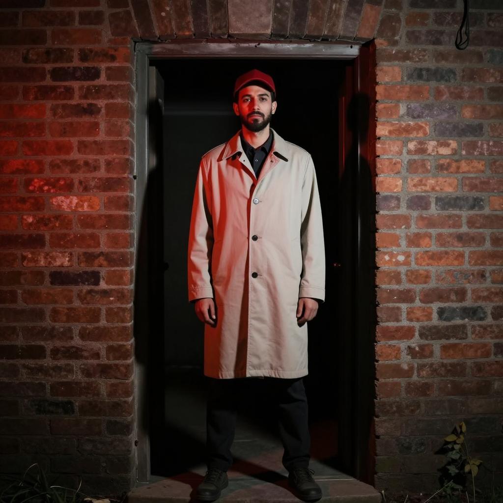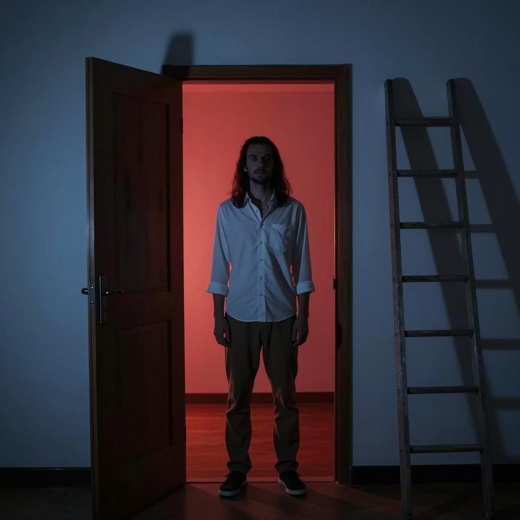 Silhouetted man with long hair, wearing white shirt and brown pants, stands in doorway with red backlight. Doorframe casts shadows on wall. Left: open door with dark, abstract pattern. Right: ladder leans against wall. Blue and red lighting.