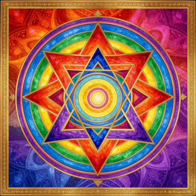The image showcases a highly detailed and symmetrical Sri Yantra, a sacred geometry symbol, set against a vibrant, psychedelic pattern background. The Sri Yantra is composed of a series of interlocking triangles and circles, arranged in a precise and intricate manner. The central triangle is surrounded by a series of concentric triangles, each progressively smaller, creating a harmonious balance. The colors within the Sri Yantra are a rainbow palette, with shades of red, orange, yellow, green, blue, and purple, adding a sense of depth and dimension to the design. The background features a gradient of warm and cool colors, transitioning from reds and oranges to blues and purples, enhancing the overall visual impact. The Sri Yantra is framed by an ornate, golden border with intricate patterns, adding a sense of grandeur and reverence to the composition. The entire image exudes a sense of tranquility and spiritual significance, with the Sri Yantra serving as the focal point, drawing the viewer's eye inward to the intricate details and harmonious balance of the design.