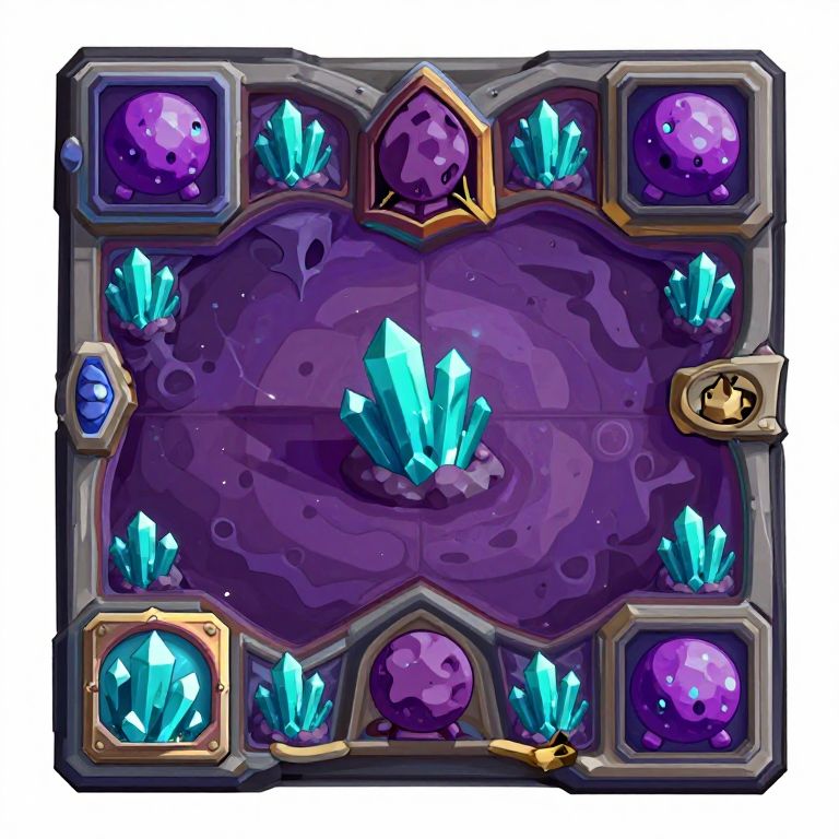 Paper top down 5x5 playing grid for card game similar to hearthstone, purple alien planet with teal crystalline ore and chasms in the background, beautiful vector art, style of Darkest Dungeon,