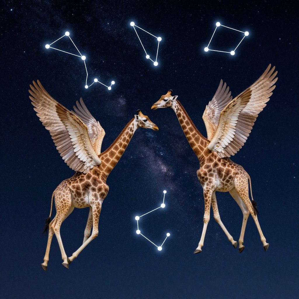 Digital artwork depicting two giraffes with wings, facing each other in mid-air against a dark blue, starry background. The giraffes have the typical brown and white patchy coat of a real giraffe, with large, feathered wings extended. Above them, a constellation of bright white stars is connected by thin lines, resembling constellations. The giraffes' long necks and legs are gracefully extended, and their heads are almost touching. The wings are detailed with light and dark feathers, adding a sense of motion and ethereality to the scene. The image combines realistic animal features with fantastical elements.