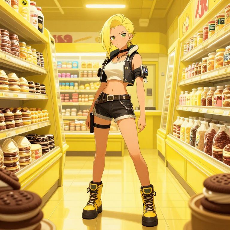 Digital illustration of a cyberpunk-style girl standing in a frozen food store with yellow tones. The character is depicted with blonde hair, green eyes, wearing a white crop top, black shorts, yellow boots, and a black vest with accessories. Shelves stocked with jars and packaged food surround her in a brightly lit, clean environment.