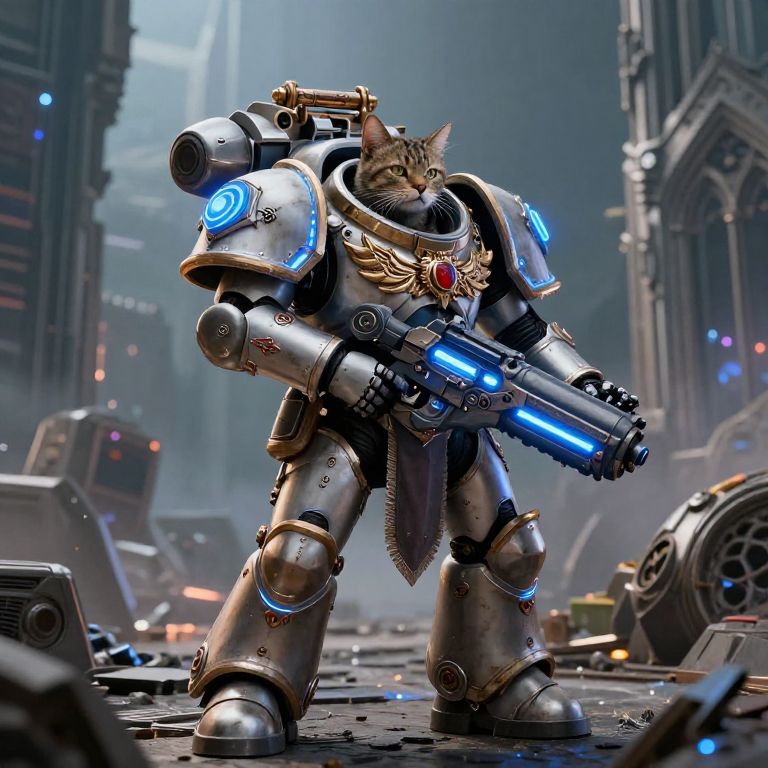 40k cat as a space marine commander, clad in ornate, bulky armor with glowing neon blue accents, holding a plasma weapon, futuristic warzone background with ruined gothic architecture, highly detailed and atmospheric