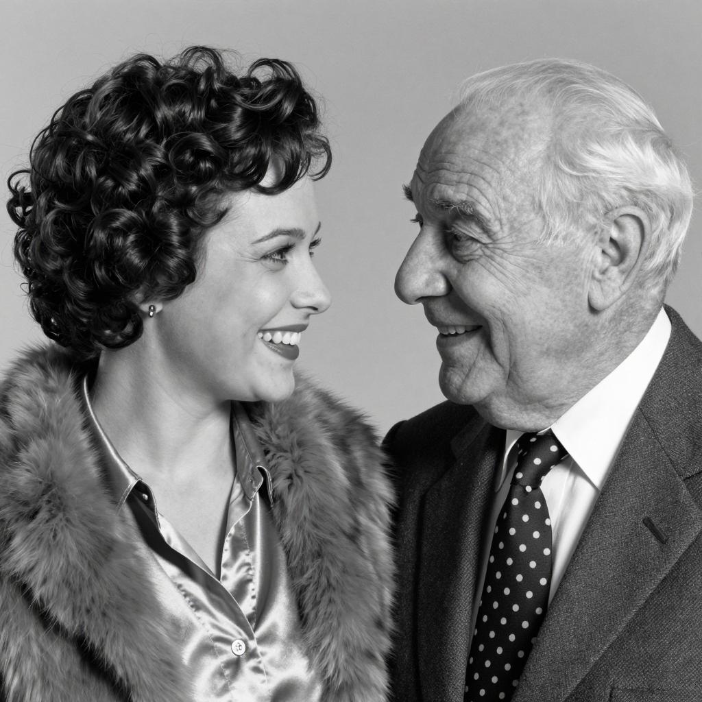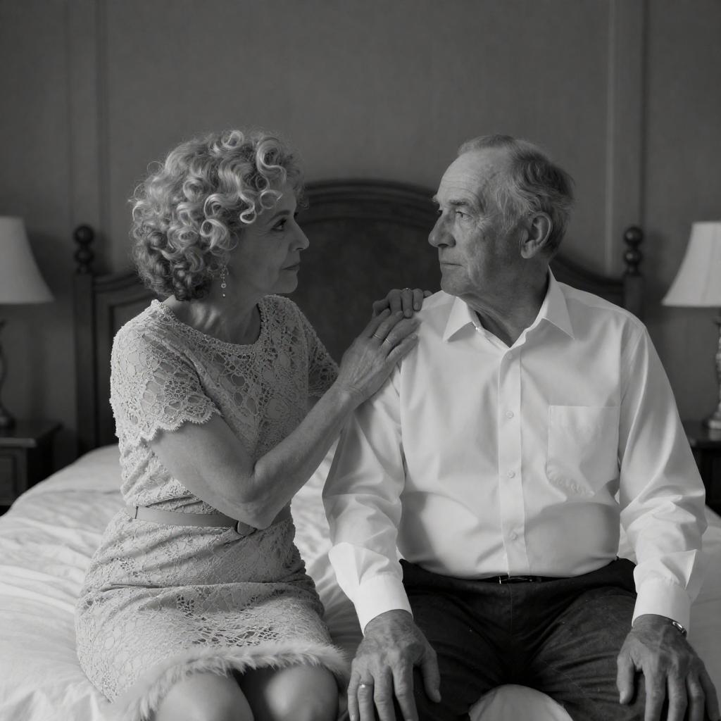 Black-and-white photograph of an older man and woman sitting on a bed. Woman with curly hair, lace dress, hand on man's shoulder, looking at him. Man with receding hairline, white shirt, dark pants, looking at her. Wood-paneled background, round headboard, bedside lamp. Woman's dress has fur trim. Man's expression is neutral, woman's expression is intense. Two people.