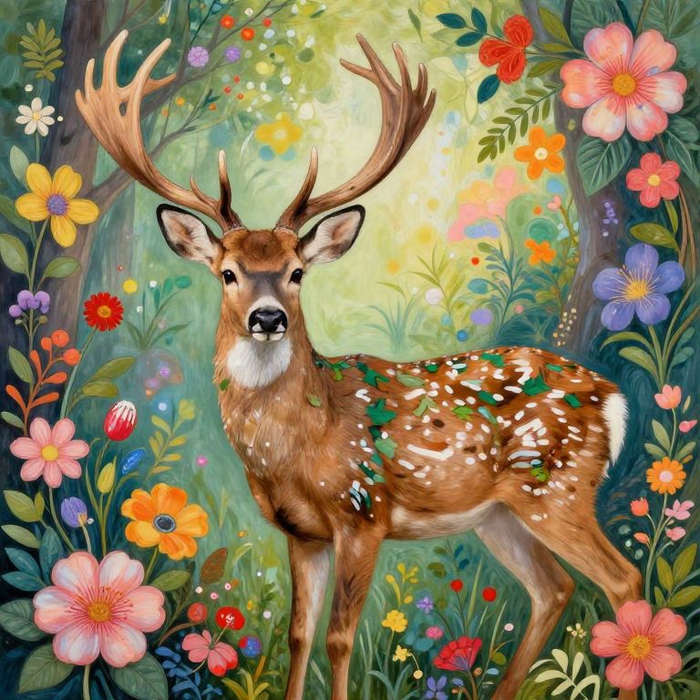 Vibrant digital illustration of a majestic deer with large antlers, surrounded by colorful flowers and lush greenery in a sunny forest.