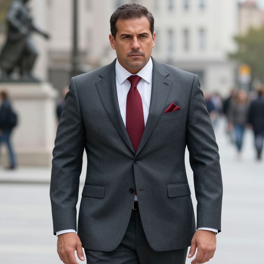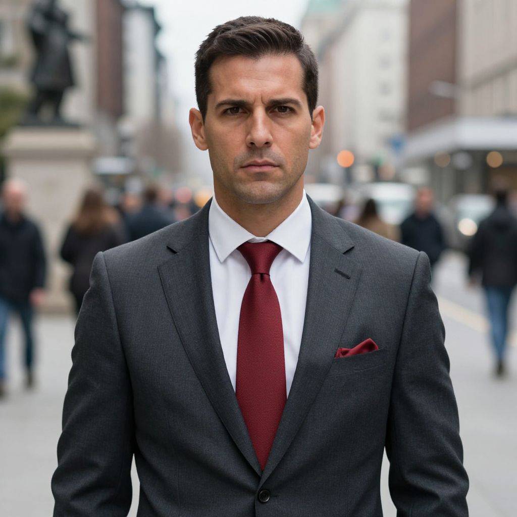 A photograph of a serious-looking man with short dark hair, wearing a sharp dark gray suit, white shirt, and red tie. He has a pocket square in the same red as his tie. The background shows a blurry city street with people and a statue on the left. The man's confident stance and the urban setting give a professional, business-like vibe.