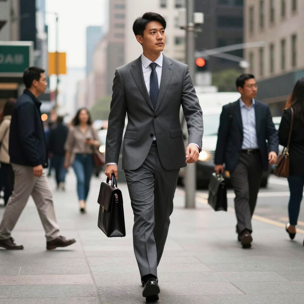 Politician suit, modern slim fit charcoal grey, walking through a bustling urban street, carrying briefcase, skyscrapers in background, dynamic and professional atmosphere