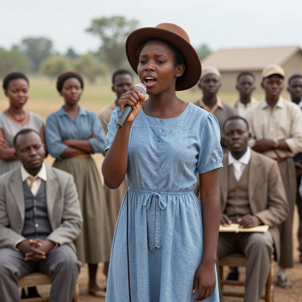 A young woman in a blue dress and brown hat stands in a group of African Americans, singing spirituals and sharing stories of hope in a 19th-century settler scene.