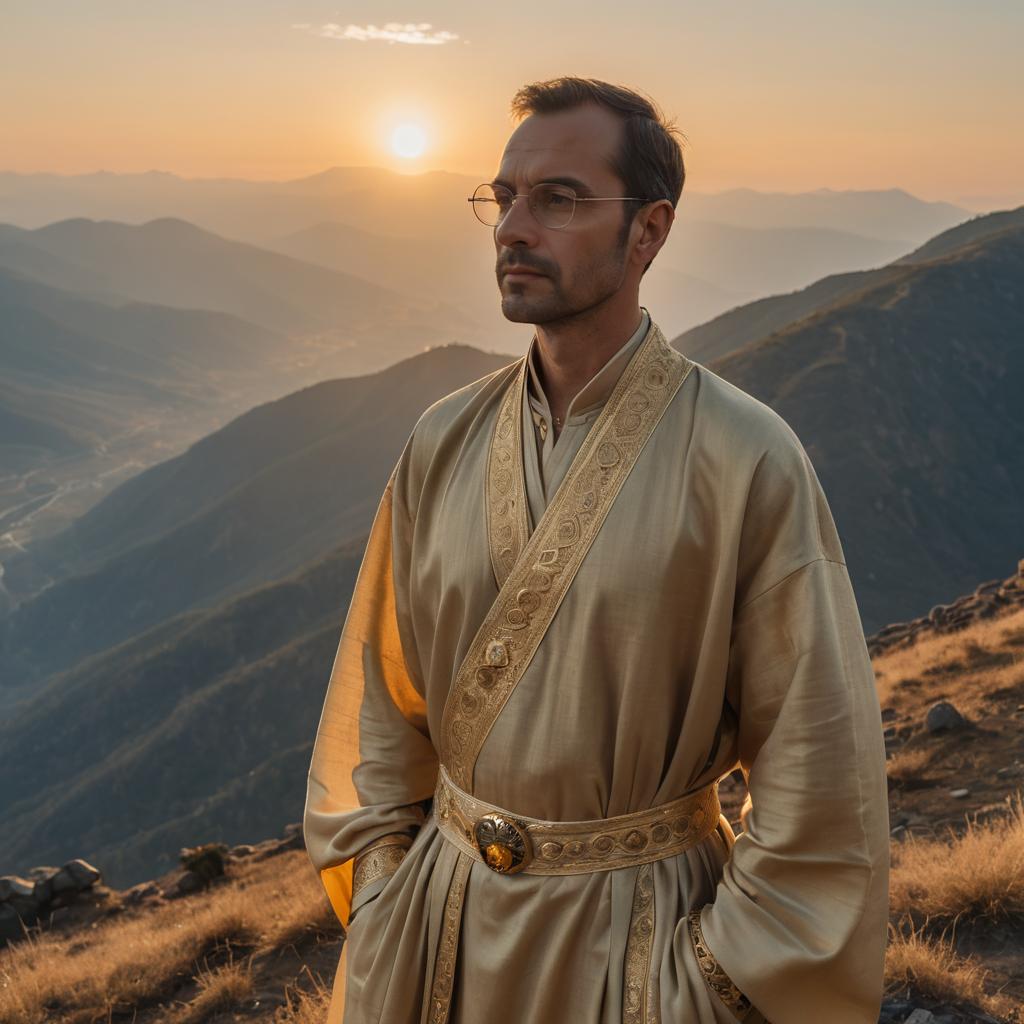 Middle-aged man wearing a traditional priest outfit with a topaz linen robe featuring gold embroidery and a belt with a gold accessory. He stands on a mountaintop at sunrise, with layered mountain ranges visible in the background. The warm golden light highlights his contemplative expression and the texture of the robe.