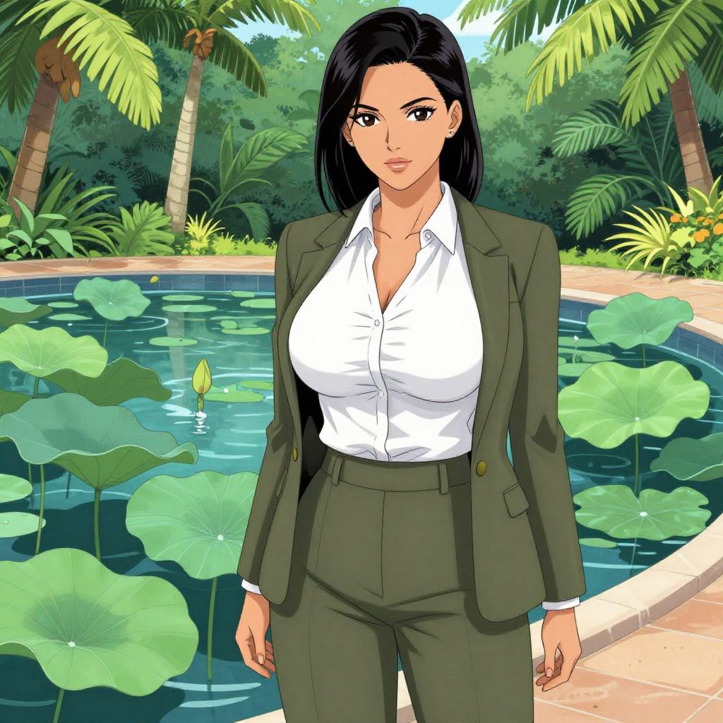 A woman in an olive green suit with a single-button blazer and matching straight-leg trousers, paired with a crisp white blouse, stands in a tropical garden with a lotus pond, illustrated in the style of Kodansha comics. Sexy. Pretty face and beutiful eyes Sexy. Pretty face and beаutiful eyes. Big breasts