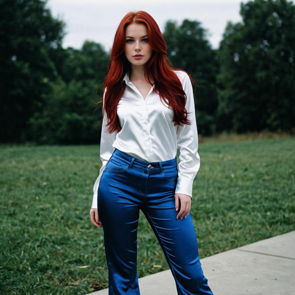 Satin pants costume,1girl, solo, pants, red hair, long hair, realistic, shirt, lips, standing, looking at viewer, long sleeves, outdoors, jeans