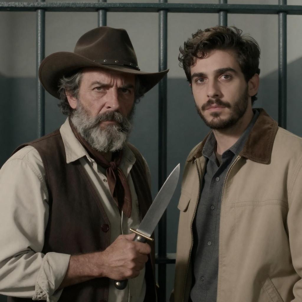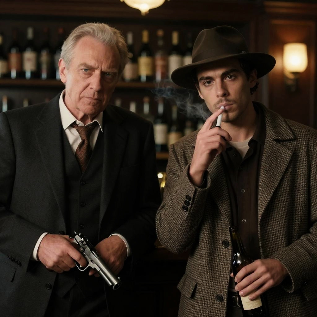 Photograph of two men in a bar. Older man with gray hair in dark suit and vest, holding a gun, looks serious. Younger man with brown hat and checkered coat, smoking, holds a bottle. Background includes shelves with bottles, dim lighting. Younger man's intense expression contrasts with older man's focused look.