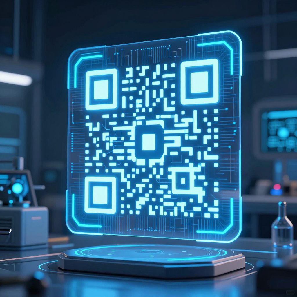 AI QR code generator in a futuristic digital interface, glowing neon blue lines forming complex QR codes, sleek holographic screen floating in a high-tech lab setting, intricate circuit patterns blending into the background, ultra detailed cyberpunk style.