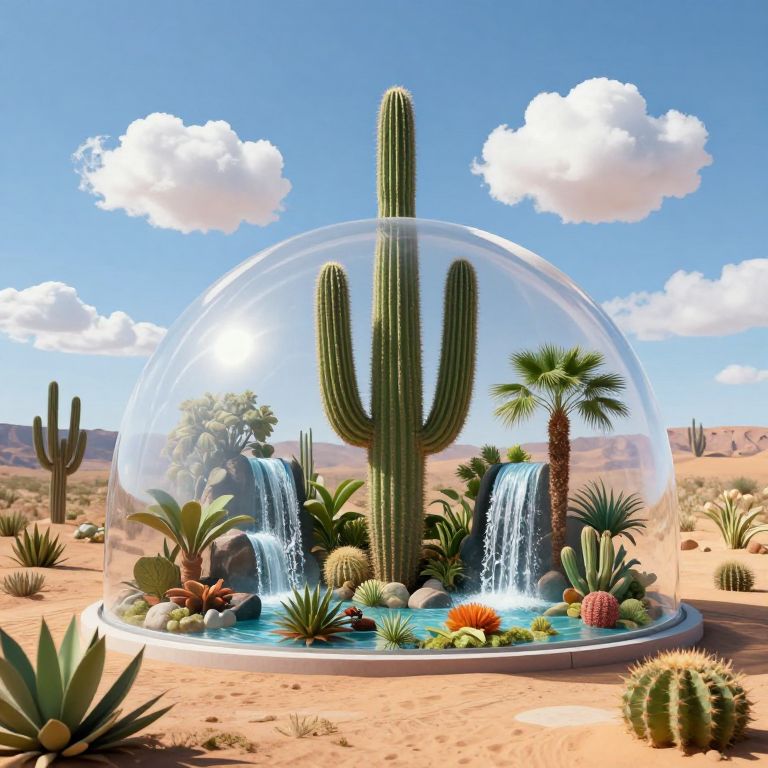 In a surreal desert landscape, a towering cactus emerges from a translucent dome, encapsulating a thriving oasis with cascading waterfalls, lush vegetation, and floating clouds, defying the arid surroundings.