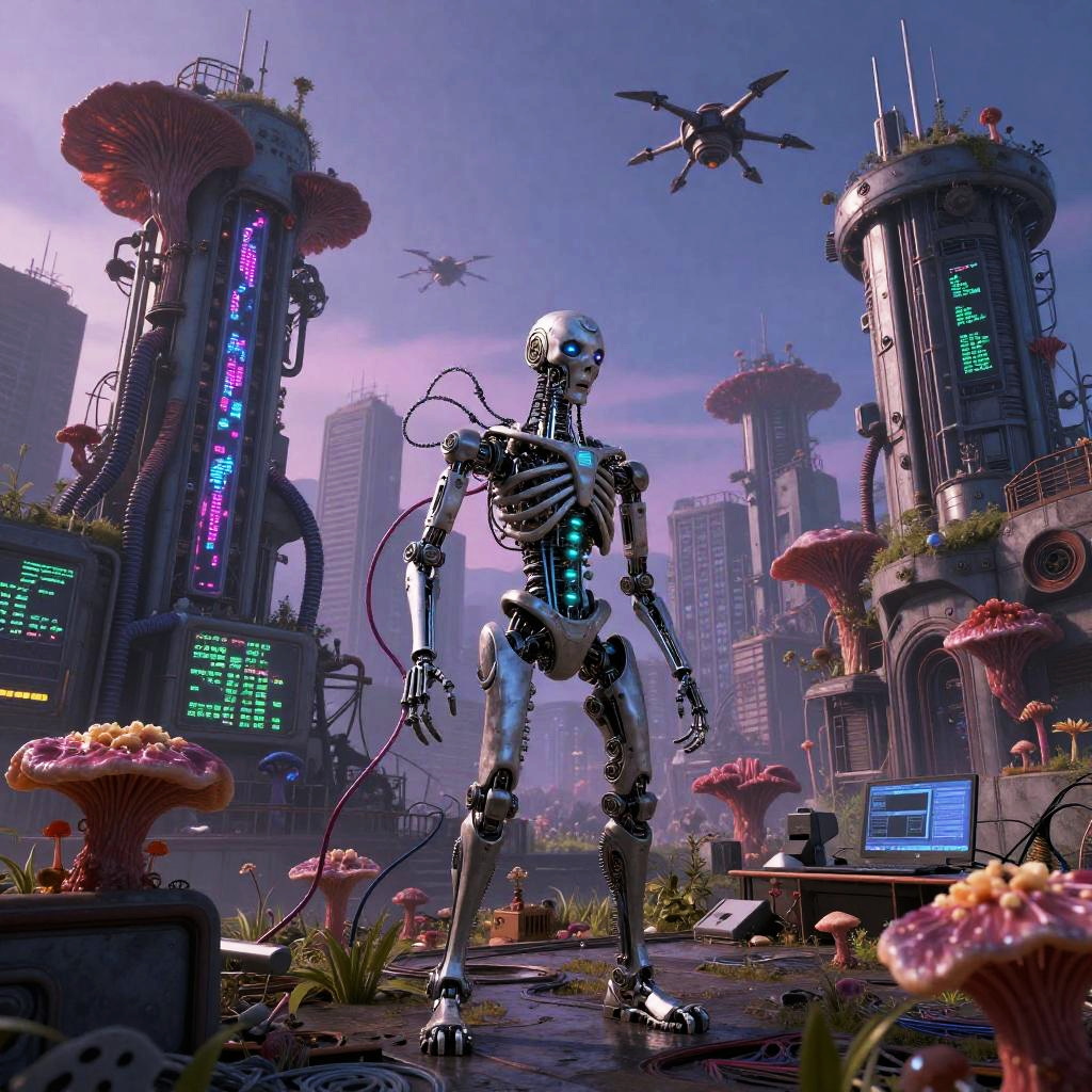 In a decrepit, overgrown metropolis, former corporate drone-captain turned reluctant archivist hides among the ruins, their body a fusion of synthetic and organic mutations. Their bio-ceramic ribcage grafted with living spore-circuits and whip-like sensory tendrils shifts in response to danger, a testament to the unchecked experimentation of corporate bioweapon research. Fungal growths sprawl over abandoned biotech facilities, their spores whispering fragmented data to those who can decipher them. Towering over the ruins, bio-mechanical monoliths stand as remnants of failed utopias, their vascular piping still pumping a strange, viscous fluid. In the distance, swarms of gene-spliced drones patrol the skies, scanning for rogue mutations. The atmosphere is acrid neon dusk thick with floating chromatophore spores and the metallic tang of decay.