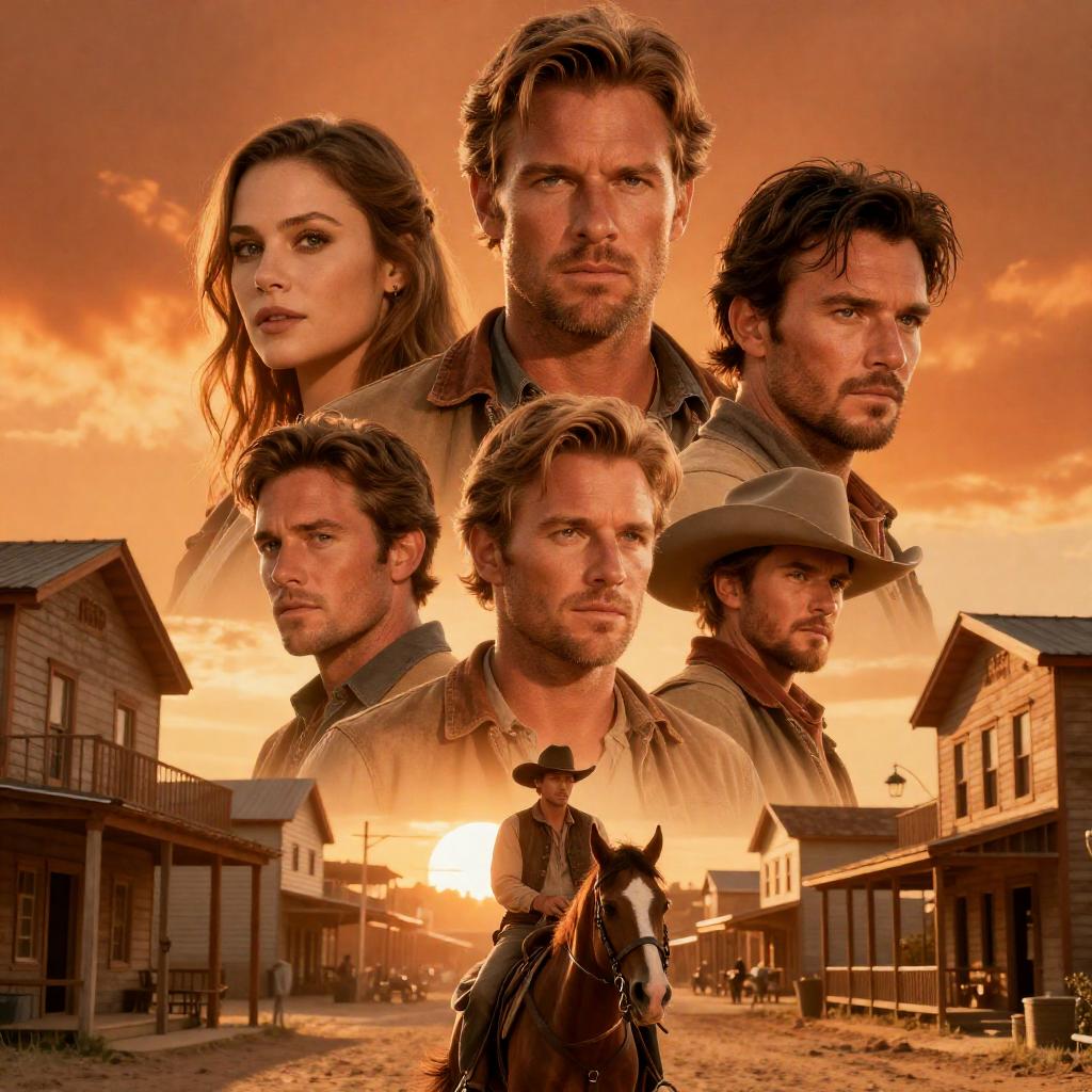 Photograph of a movie poster. Central figure: woman in white gown, feathered headdress, glowing, surrounded by light rays. Right: man with dark hair, bow tie, confident expression. Bottom: man with beard, serious, hands raised. Left: older man, stern expression. Background: dark, star-like lights.