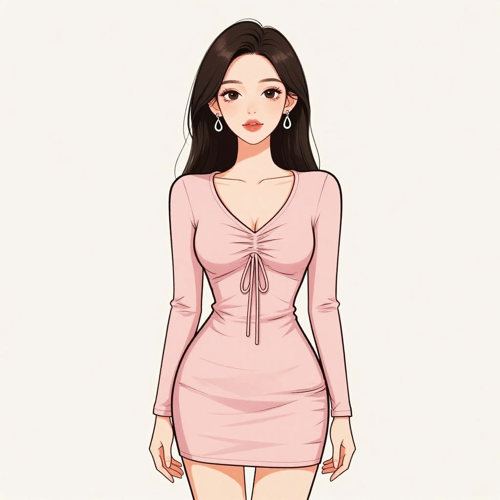 Woman with pretty face and pretty hair. Woman, modern chic, bodycon mini dress in pastel blue, short sleeves, crew neckline, form-fitting silhouette, textured fabric, knee-length, simple hairstyle with a high ponytail, white studio background. --sref 1467