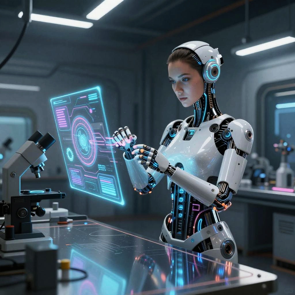 Photograph of a young Caucasian girl with fair skin and brown hair, wearing a light gray t-shirt, holding a futuristic, glowing tablet displaying a holographic skeletal figure. She has blue eyes, a focused expression, and is illuminated by the tablet's blue light. The background is a dimly lit, modern room with blurred, dark-colored furniture and screens. The image has a sci-fi, tech-themed aesthetic, emphasizing the holographic technology. The girl's hands are positioned at the lower center of the image, and the tablet is held in front of her chest.