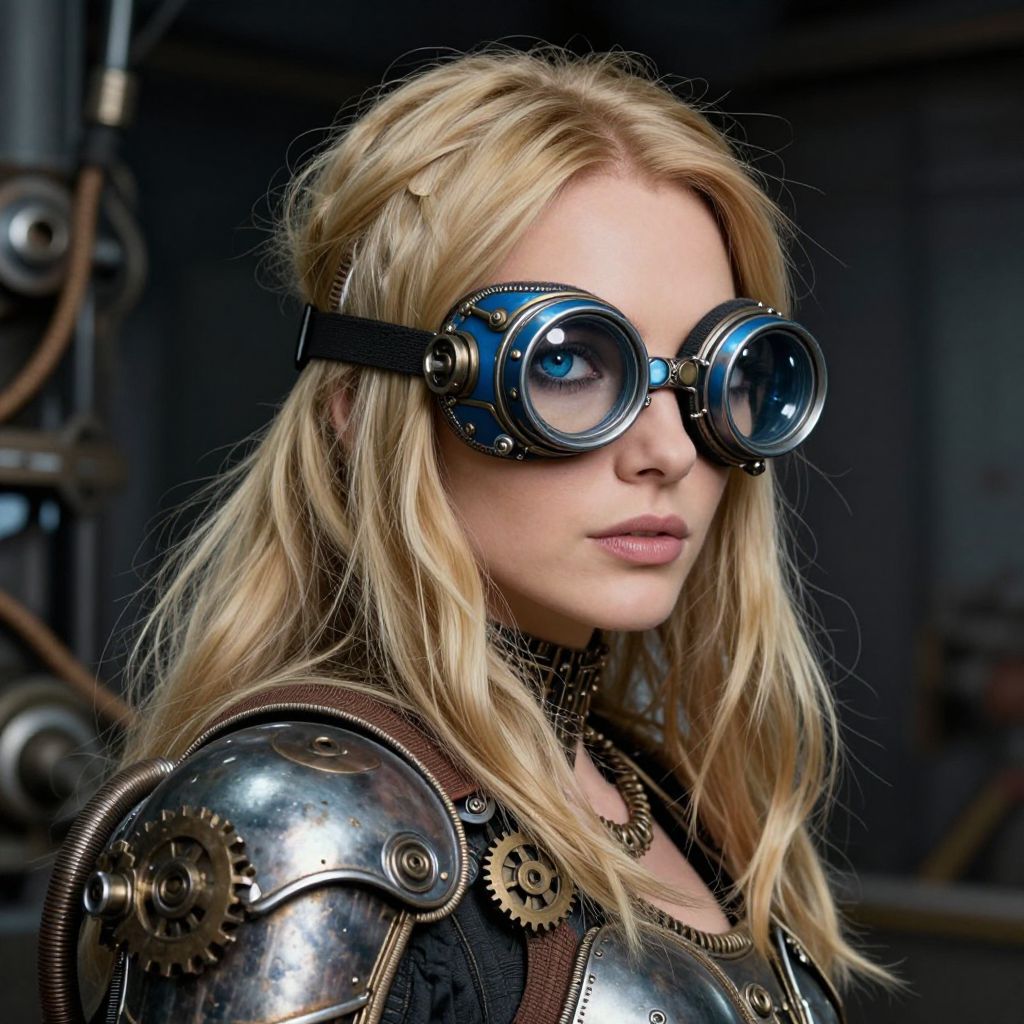 Photograph of a blonde woman with steampunk goggles, wearing metallic armored shoulder plates, in a dark, industrial background.