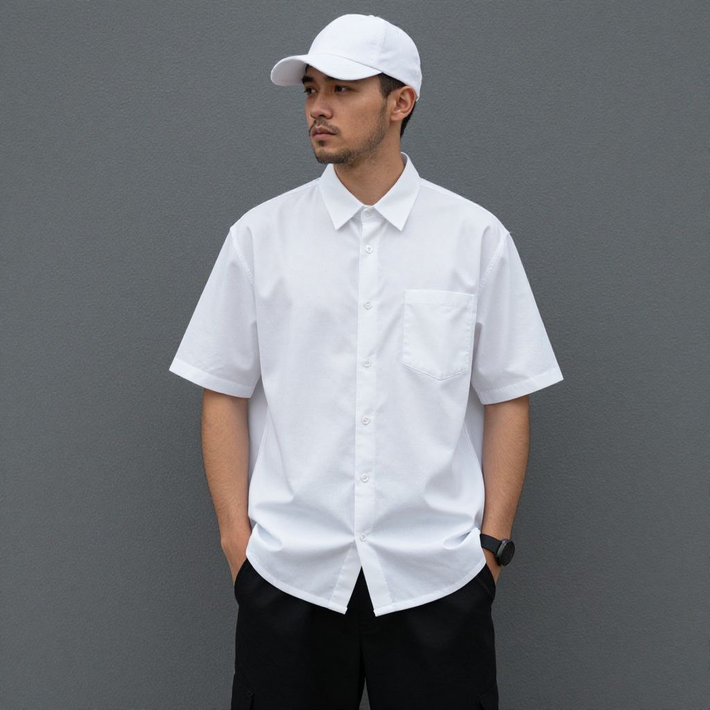"simple costume wear work, 1boy, male focus, solo, baseball cap, hat, hands in pockets, pocket, standing, shirt, full body, breast pocket, facial hair, white headwear, realistic Realistic photo of casual sexy person with pretty face"