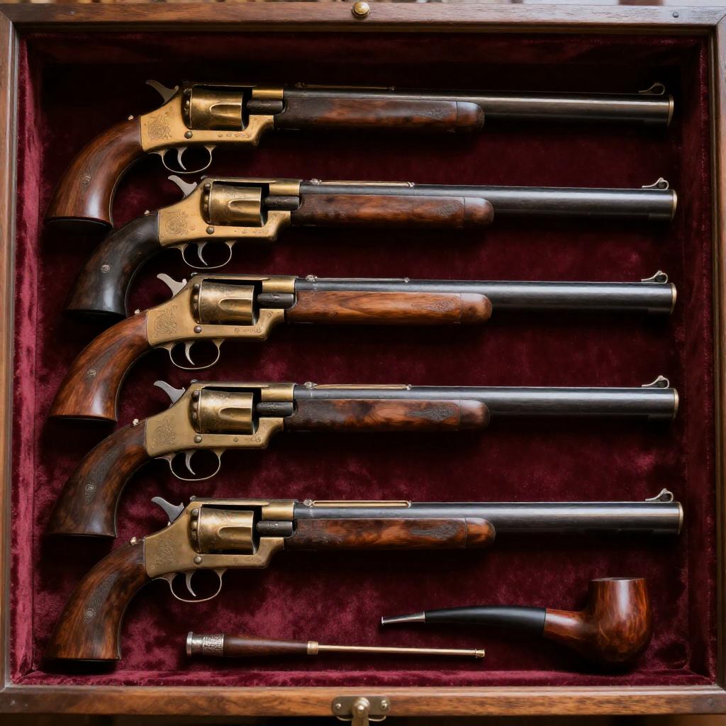 Photograph of an antique firearms display case with a rich, burgundy velvet interior. The case contains six ornate, brass and wood firearms, including revolvers and pistols, arranged horizontally. Each gun features intricate engravings and polished metalwork, with a wooden pipe and various small tools also included. The lighting highlights the metallic sheen and wood grain ures.