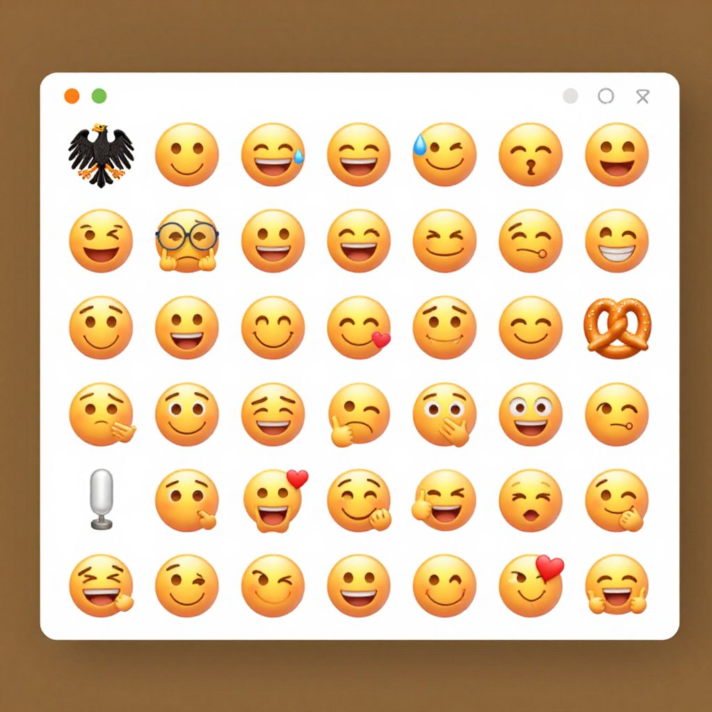 Animated German emoticons website visual concept, array of emoticons smiling and communicating, subtle incorporation of traditional German symbols like the eagle or pretzel, sleek UI design with warm inviting colors, digital art style with high detail