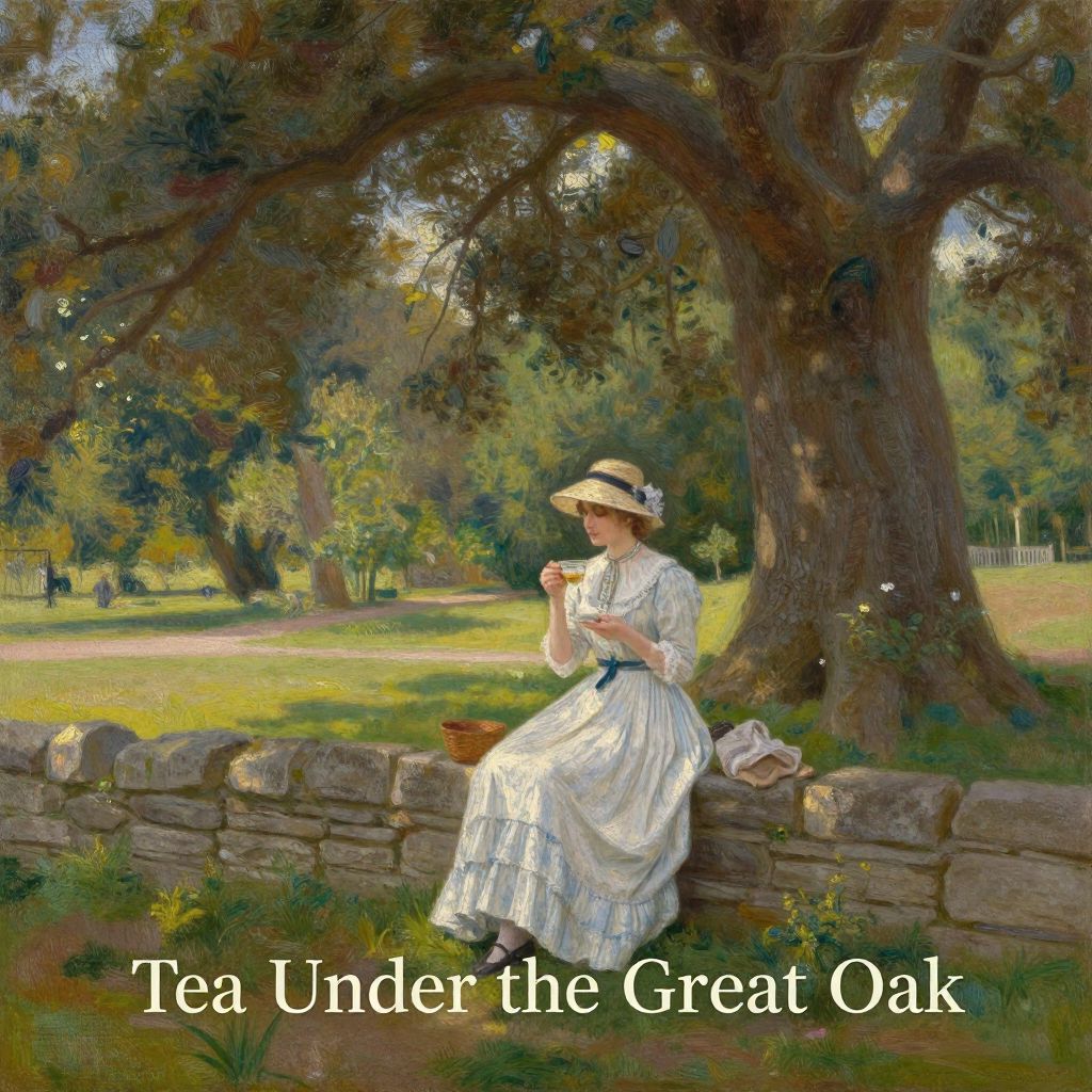 A serene oil painting titled \"Tea Under the Great Oak\" by Timothy Easton captures a woman in a vintage dress and hat sitting on a stone wall beneath a majestic oak tree, enjoying a cup of tea amidst a sunlit park with soft, impressionistic lighting and lush greenery.