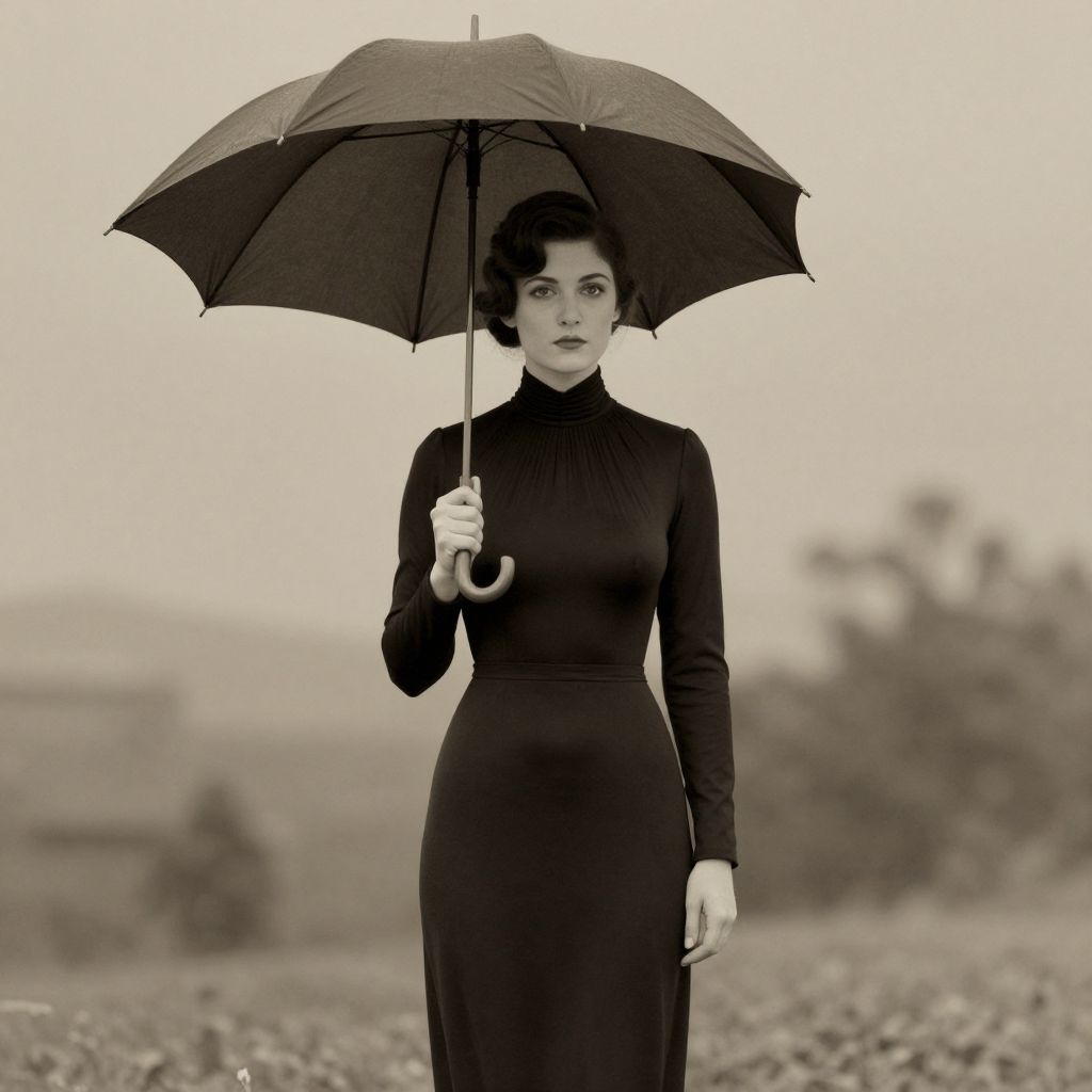 A vintage-inspired digital illustration depicts a woman in a high-collared black dress holding a dark umbrella, set against a sepia-toned background with a retro aesthetic reminiscent of 1891 photography.