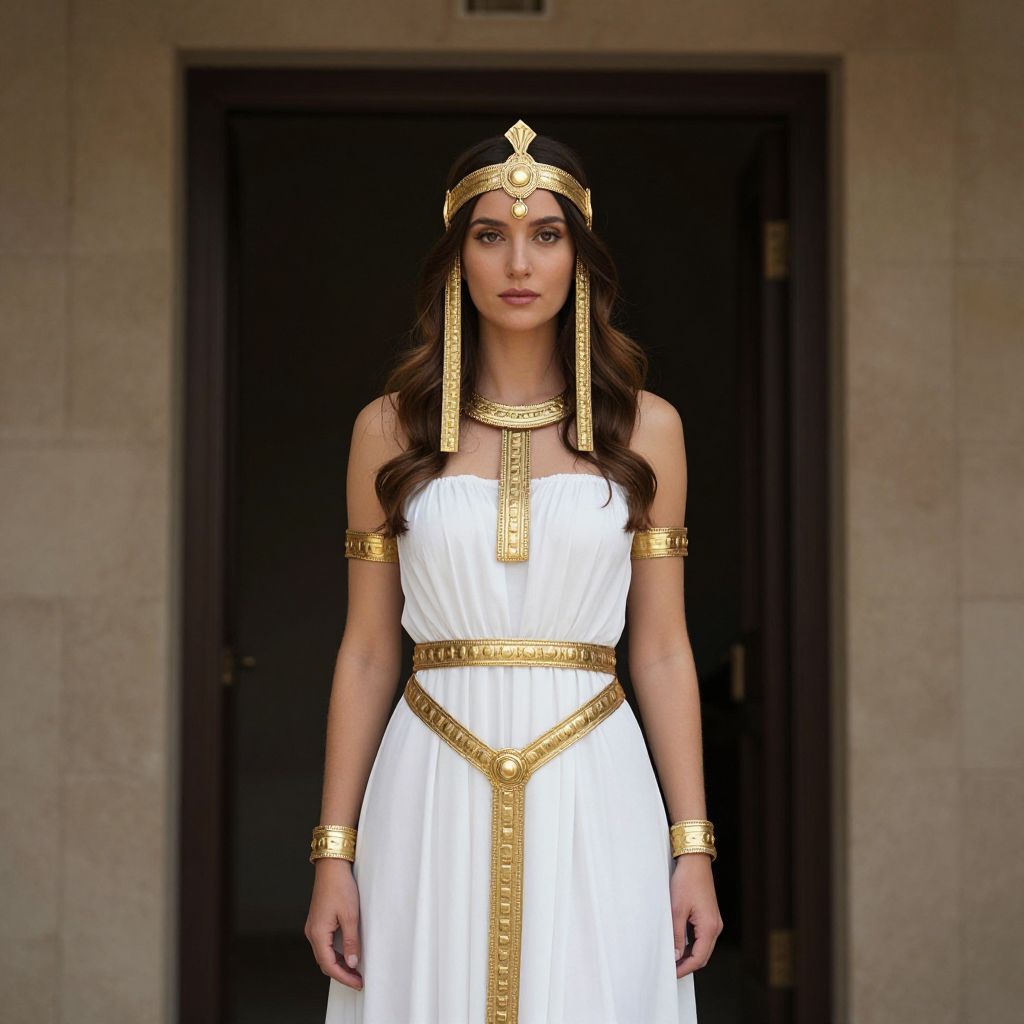 Photograph of a young woman with long, wavy brown hair standing in front of a dark door. She wears an elegant, white, sleeveless dress adorned with gold trim and jewelry, including a headpiece, arm bands, and a belt. Her expression is neutral, and she gazes directly at the camera. The background is a plain, light-colored wall. The woman's fair skin and slender build are highlighted by the bright white dress and gold accents, creating a regal, ancient Greek-inspired look. The image has a sharp, realistic quality.