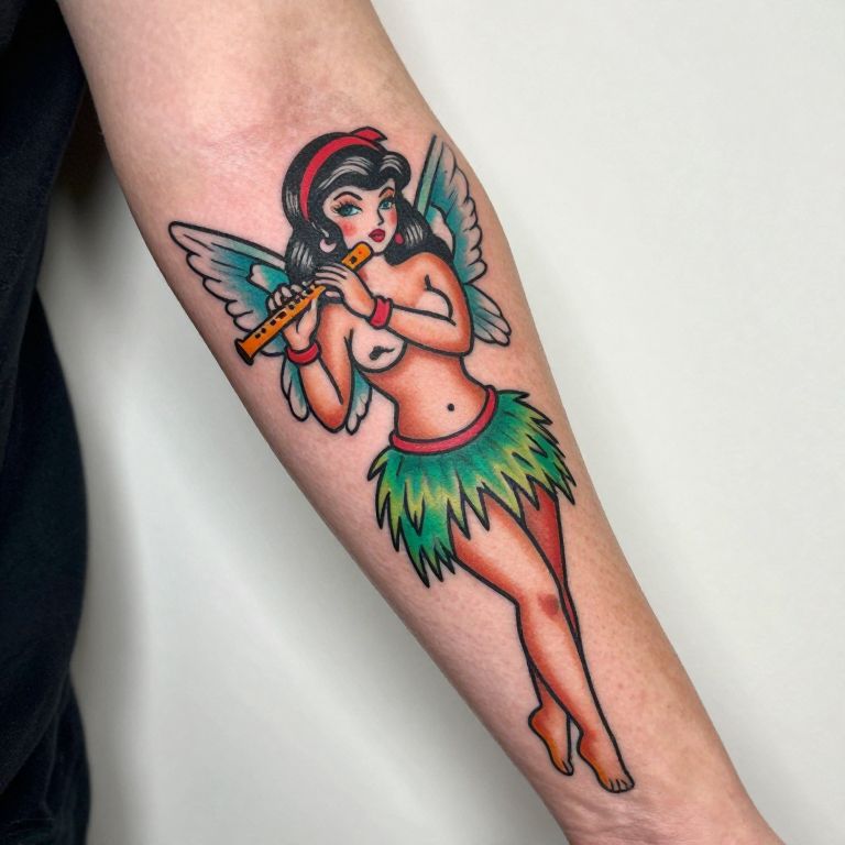 Tattoo of a cartoon-style, topless fairy with green skirt, playing a flute, on a human arm. Bright colors, winged,