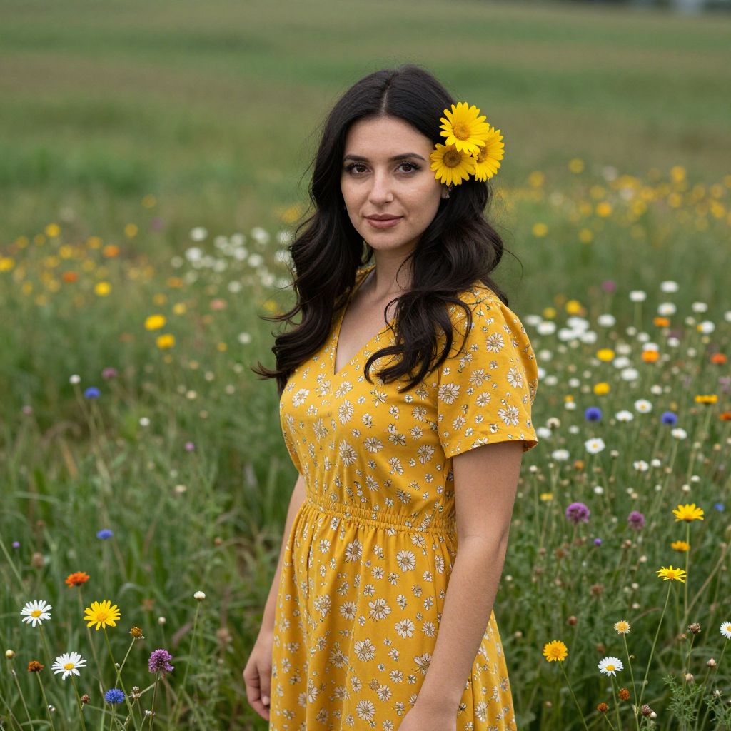 Woman standing amidst vibrant wildflowers, her dark hair adorned with two bright yellow daisies, wearing a mustard-yellow dress with delicate floral patterns, set against a lush meadow backdrop.