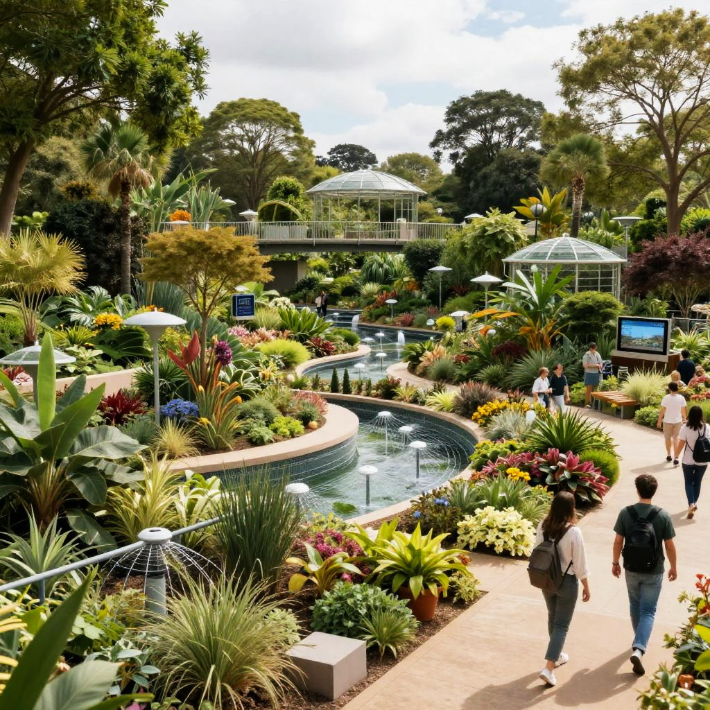 Garden design AI illustrating a large public botanical garden with AI-managed ecosystems, multi-layered planting zones, advanced irrigation networks, and visitors enjoying nature enhanced by technology, in a panoramic, hyperrealistic style with crisp details.