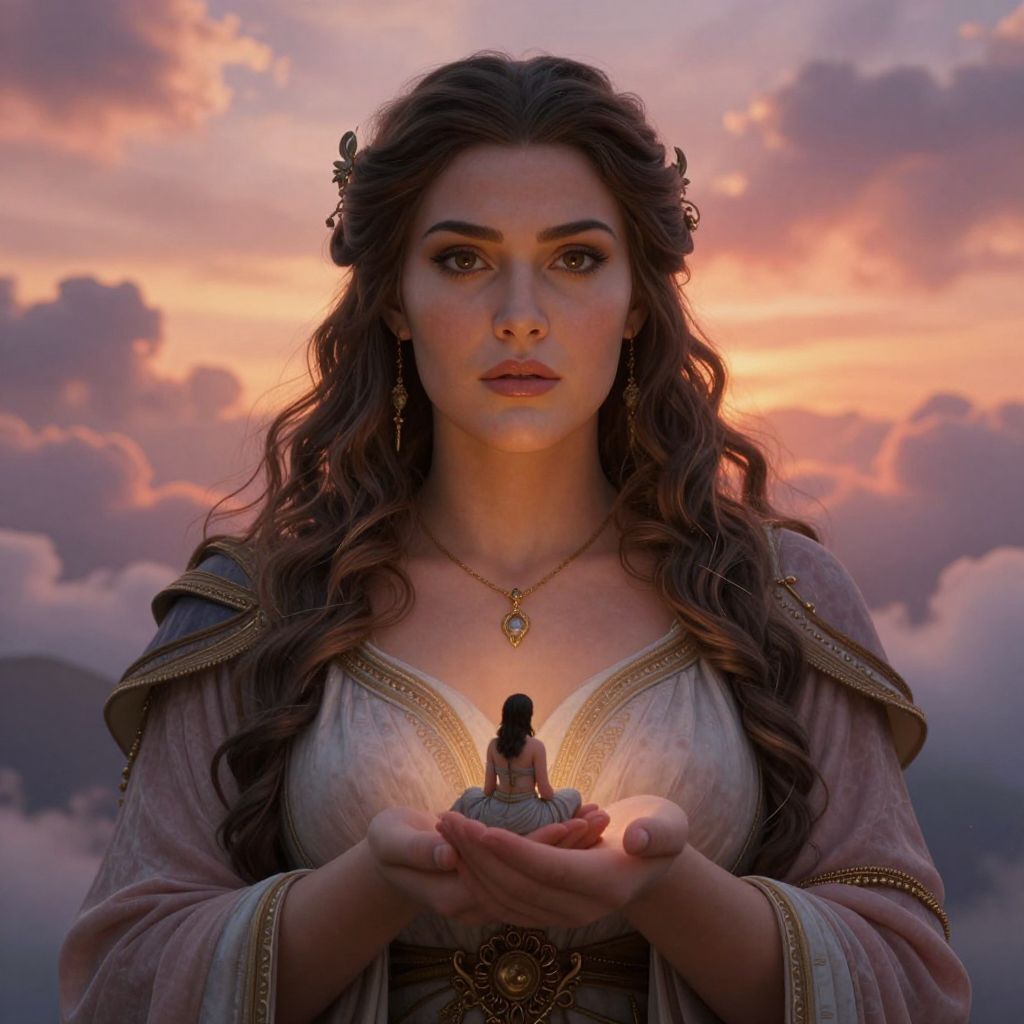 Digital artwork of a mystical woman with long, wavy brown hair and fair skin, holding a small, seated figure in her hands at sunset, wearing