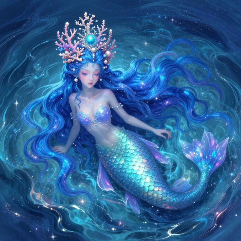 A mesmerizing digital art portrait showcases an otherworldly mermaid gracefully navigating through a nebula adorned with rich hues of deep purple, captivating blues, and radiant golds. Drawing inspiration from the enchanting realms of Studio Ghibli's cinematic masterpieces, this celestial being exhibits an opalescent tail that sparkles like stars against the night sky. Her face bears exquisite luminescent markings, akin to ancient constellations, symbolizing a connection to timeless wisdom and cosmic knowledge. Emerging from a swirling maelstrom of stardust, her features are illuminated by the light of distant galaxies, creating an ever-evolving tapestry of celestial shades that evoke a sense of awe, intrigue, and the vastness of the universe itself.