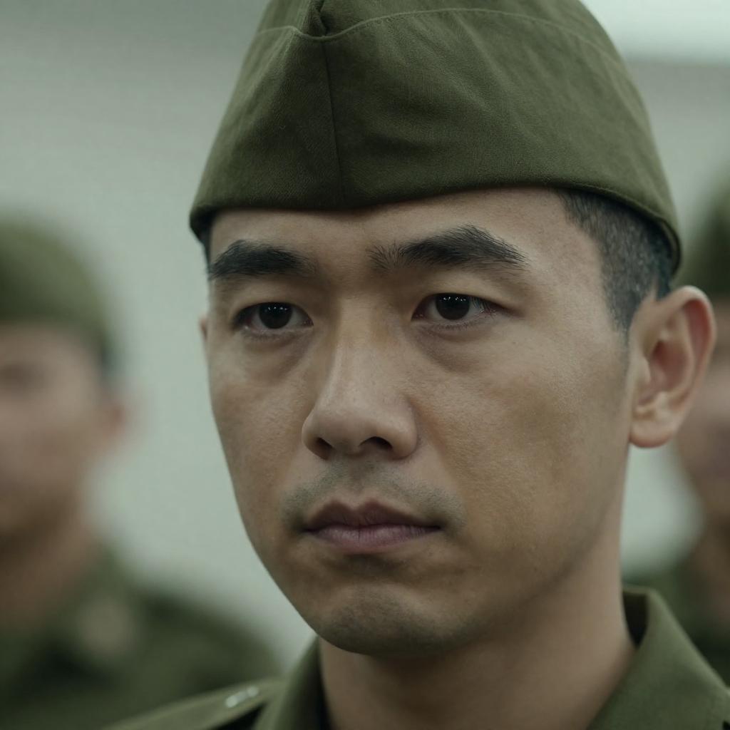 Close-up of a serious-looking man with medium brown skin and dark eyes, wearing a blue and orange futuristic helmet. He is inside a transparent, glowing orange and yellow cockpit. The helmet has intricate blue patterns.