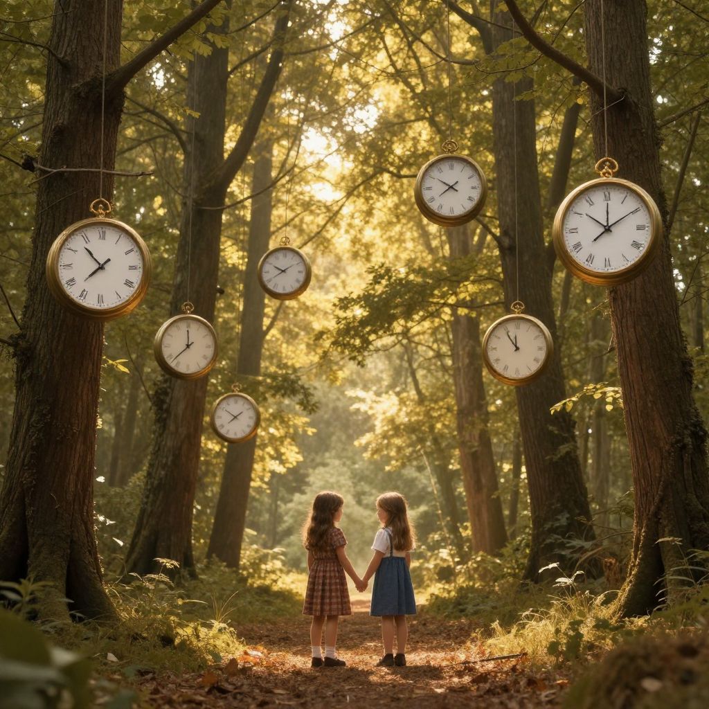 In a serene forest bathed in golden light, two children hold hands beneath clocks suspended from the trees, defying gravity and hinting at a world where time bends to the innocence of youth.