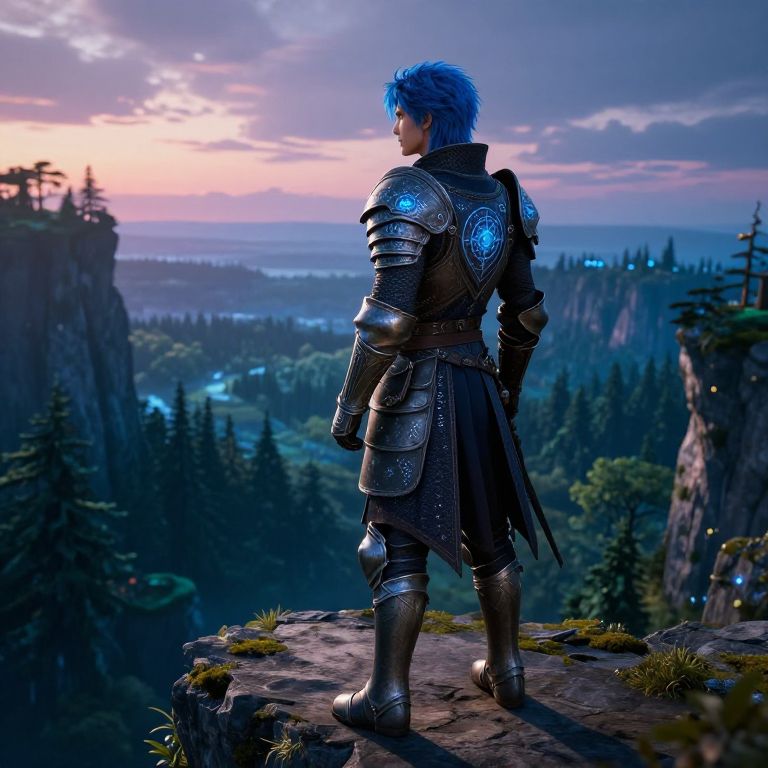 Blue hair characters male in a fantasy world, wearing medieval armor with magical runes, standing on a cliff overlooking a vast enchanted forest under a twilight sky, epic cinematic lighting, highly detailed character design.