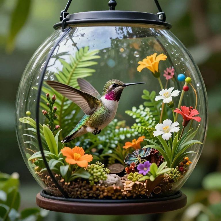 A vibrant digital artwork depicts a hummingbird perched within a suspended glass terrarium, showcasing a miniature ecosystem brimming with lush greenery, colorful flowers, and intricate details, evoking a surreal blend of natural beauty and artistic imagination.