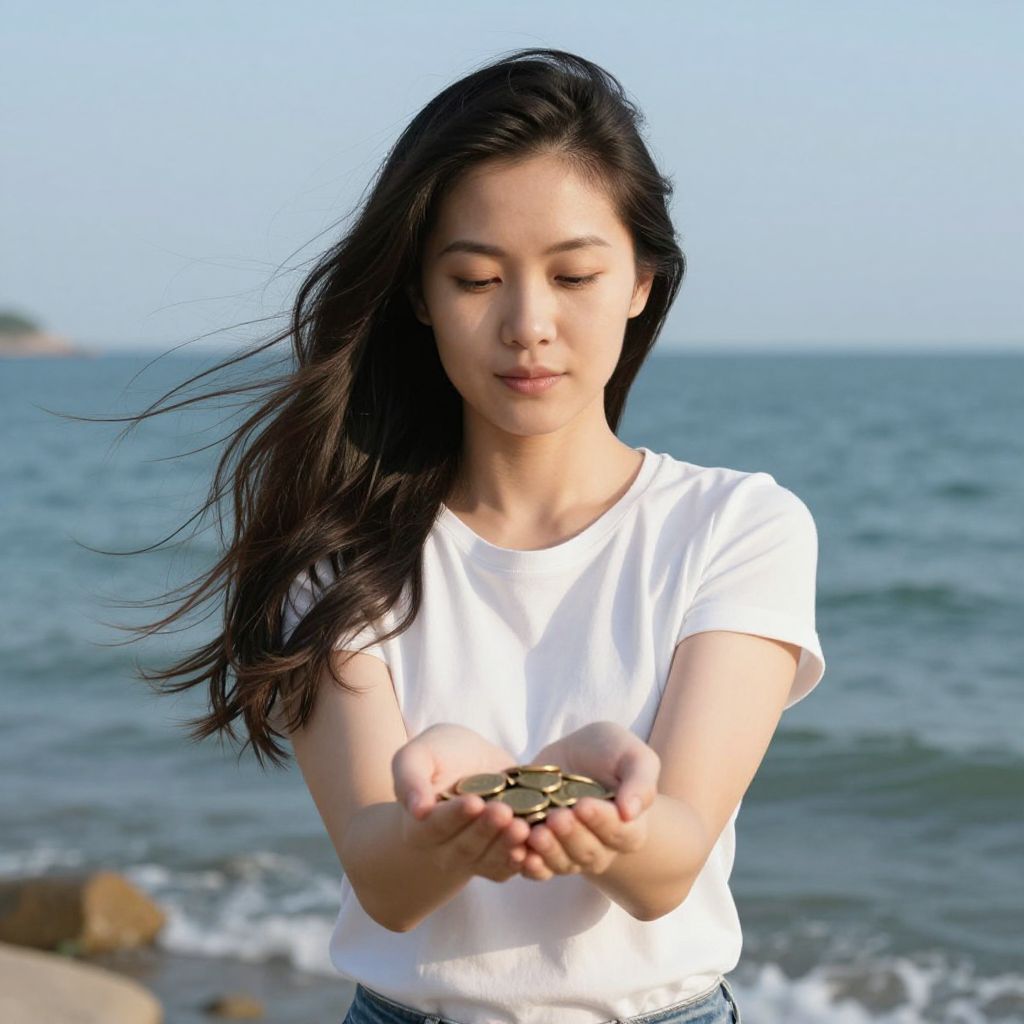 Woman standing by the ocean, her long dark hair flowing in the breeze as she holds a handful of golden coins in her outstretched hand, symbolizing the silent exchange of value in a tranquil coastal setting.