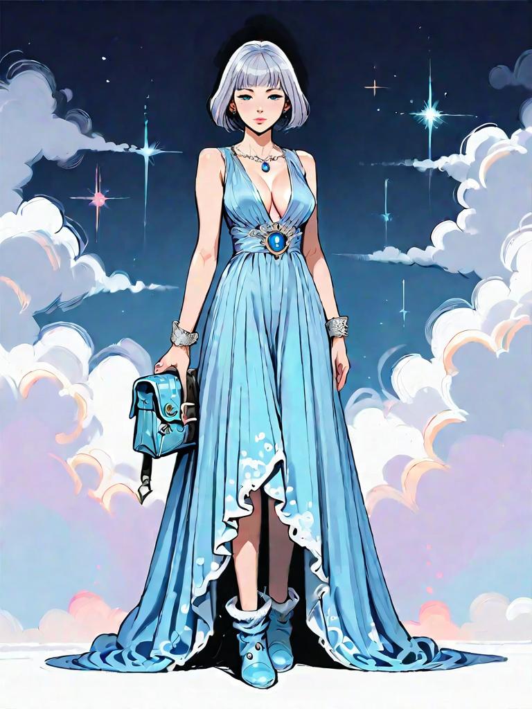 Digital illustration of a full-body female character in a dark fantasy style at nighttime. She wears a flowing blue satin high-low dress with a plunging neckline and intricate detailing on the waist. The outfit is accessorized with silver ankle boots, a minimalist silver bracelet, a blue pendant necklace, and a blue crossbody bag. Background features soft clouds and glowing stars, creating a mystical atmosphere.