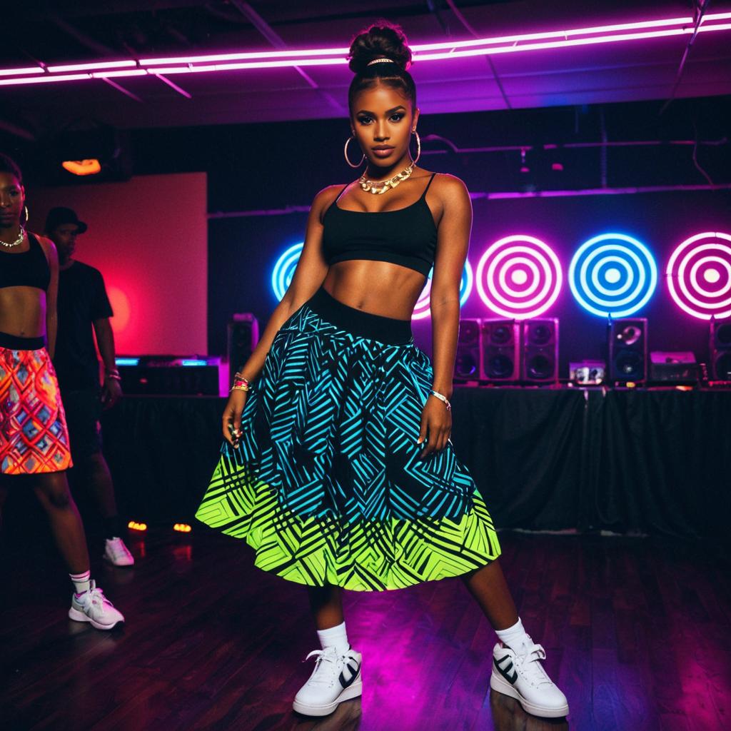 Dark-skinned young woman posing confidently in a neon-lit dance studio. She wears a black crop top paired with a multicolored skirt featuring blue and neon green geometric patterns. Her hair is styled in a high bun, accessorized with hoop earrings and chunky gold jewelry. White sneakers and socks complete her modern hip hop dance look.