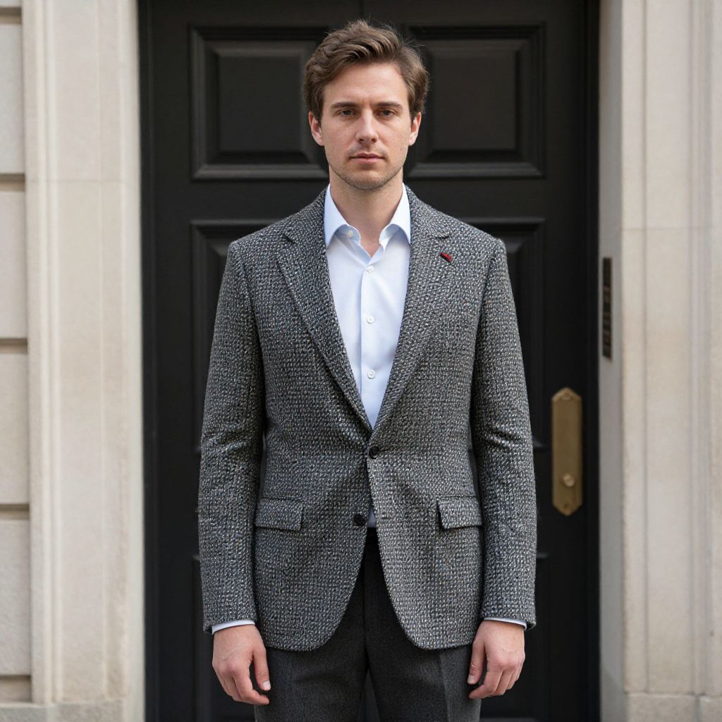 "Tweed Blazers Man, man in a suit standing in front of a door"