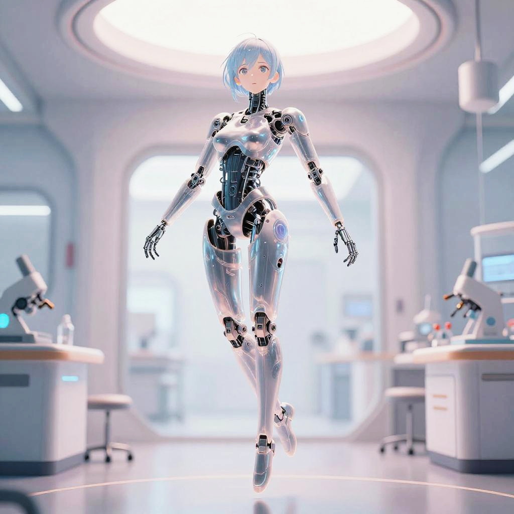 Anime cyborg with transparent mechanical limbs displaying inner workings, elegant and ethereal, floating in a high-tech lab, soft lighting, pastel color palette mixed with metallic textures