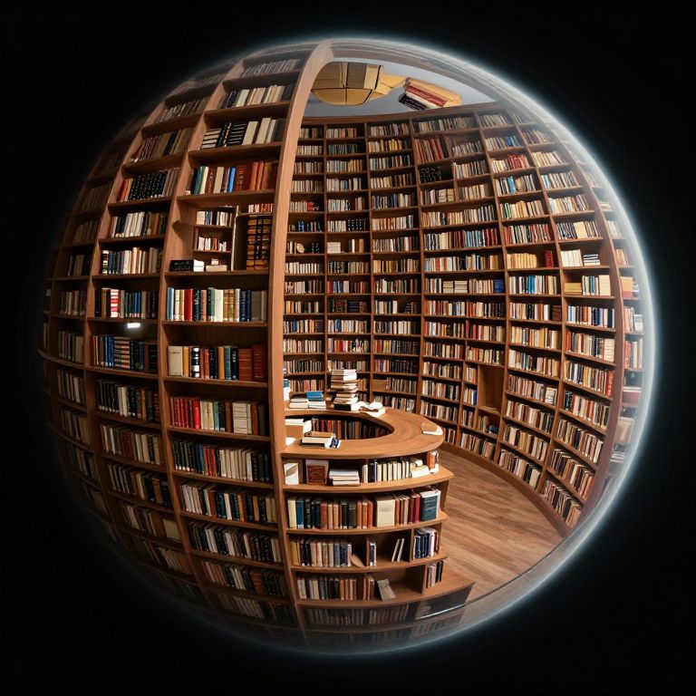 Photograph of a spherical library viewed from outside, with a fisheye lens effect. The sphere is filled with densely packed wooden bookshelves, containing a variety of colorful books. At the center, a round wooden table with a white lamp and a blue book is visible. The shelves and table are illuminated by warm light, contrasting with the dark background. The image has a glowing white border, emphasizing the spherical shape. The overall scene has a futuristic, almost sci-fi feel due to the fisheye lens and lighting.
