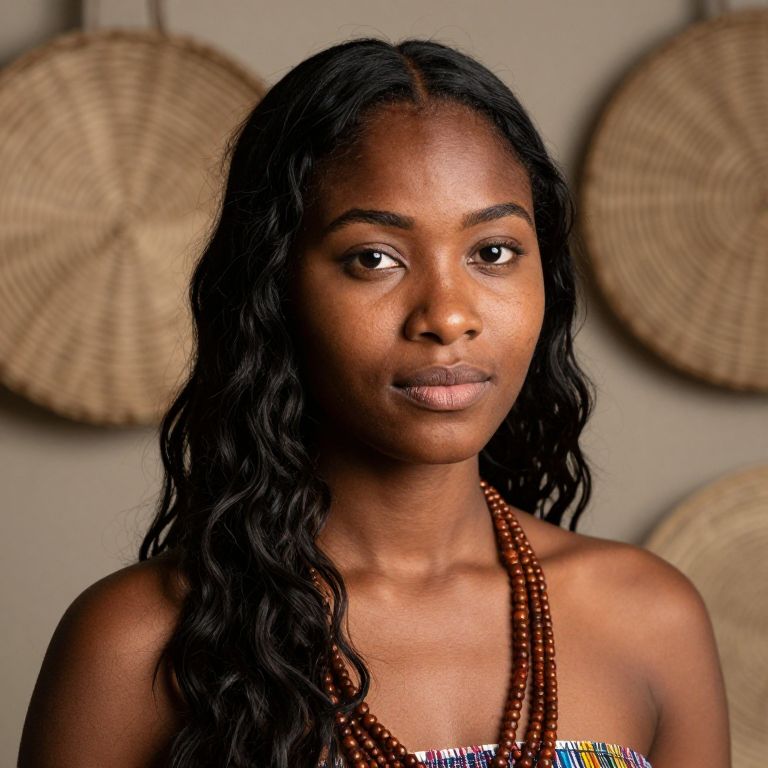 In the background, subtle textures of woven baskets and natural materials from her environment provide depth without distracting attention away from her captivating presence. This portrait should not only capture a moment in time but also evoke feelings of empowerment, heritage, and timeless beauty that resonate deeply with those who view it.